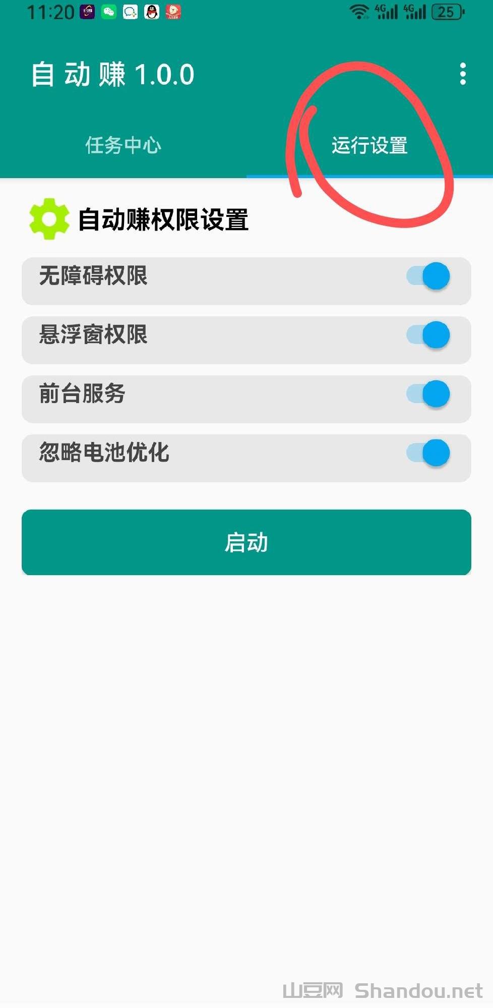 登录自动赚APP后,点击“运行设置”,打开全部无障碍选项,点击底部启动即可免费开挂搬砖。