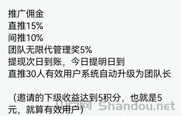 推广佣金:直推15%,间推10%,团队**管理奖5%;