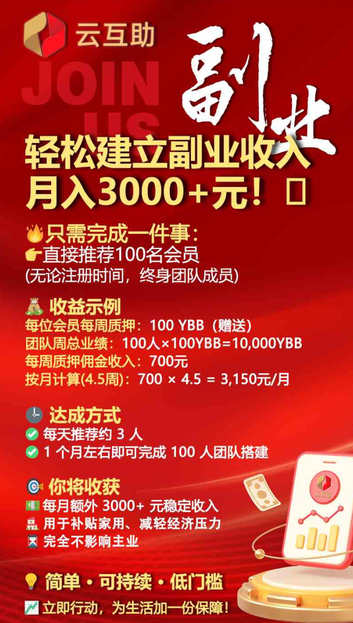云互助还为用户提供了丰厚的邀请奖励。每邀一位新用户加入,推荐人将获得3YBB以及60算力的奖励。团队奖励机制也非常诱人,团队成员的算力同样可以带动整体收溢增长。