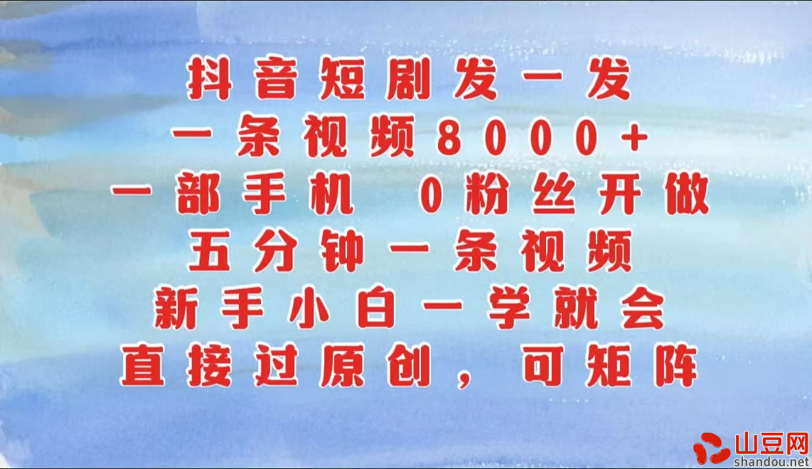 抖音短剧发一发,一条视频8000+,五分钟一条视频,新手小白一学就会,只要一部手机,0粉丝即可操作